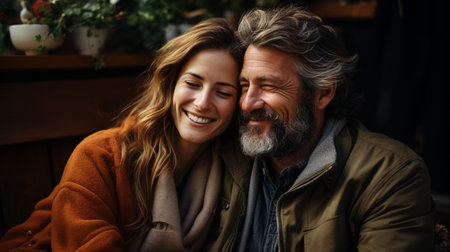 A man and woman are depicted laughing joyfully, heads close, in natural lighting. The image features a shallow depth of field, with soft colors and blurred background. Could be used to illustrate concepts of happiness, relationships, or lifestyle for various commercial and editorial applications.