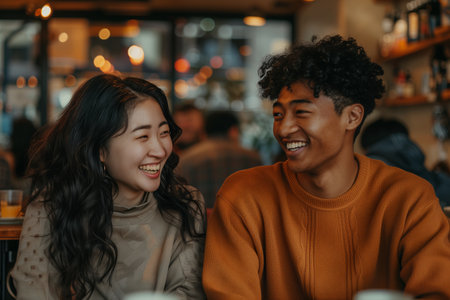 Young couple talking happily in a coffee shop.
