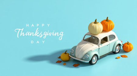 A retro mint and cream car carries pumpkins beside autumn leaves on a vivid blue backdrop, capturing festive warmth, seasonal decor and holiday spirit ideal for Thanksgiving themes. Generated A.I.