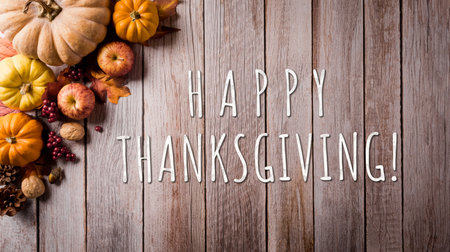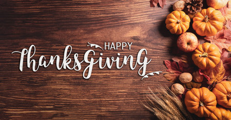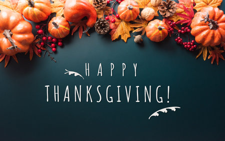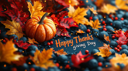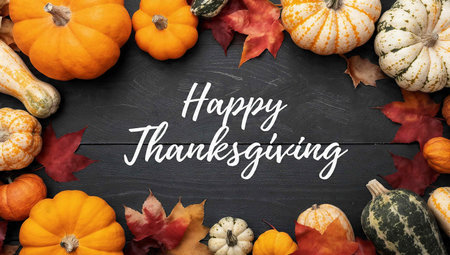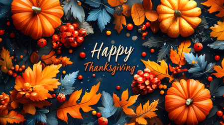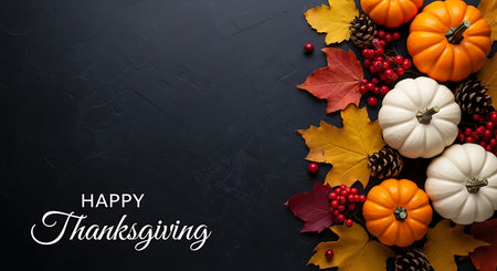 A festive arrangement of colorful pumpkins, vibrant maple leaves, and dark red berries adorns the right side of a dark, textured background, celebrating the spirit of Thanksgiving.