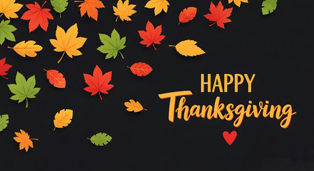 A festive Thanksgiving design features a cascade of colorful autumn leaves in red, orange, and green. The words Happy Thanksgiving are elegantly written in a warm, inviting font on a dark background.