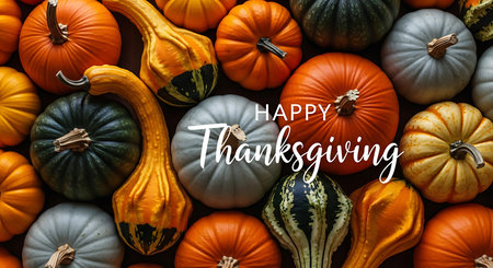 A rich tapestry of autumn's bounty, this image showcases an assortment of pumpkins and gourds in diverse shapes, sizes, and colors, creating a warm and inviting Thanksgiving greeting.