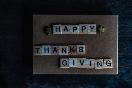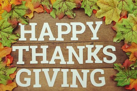 Happy Thanksgiving alphabet letters and maple leave on wooden background