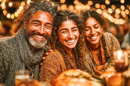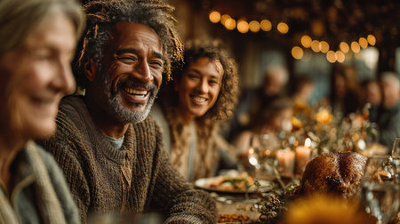 Joyful family gathering smiling individuals enjoying a festive meal, surrounded by warm lights and delicious food, creating a cozy ambiance.