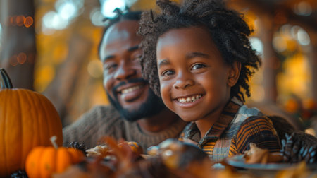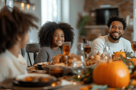 Family enjoying a joyful Thanksgiving dinner around a beautifully decorated table with pumpkins and festive dishes in a cozy setting