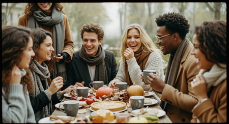 A lively scene captures a multicultural group of friends and family enjoying a meal together, radiating warmth and joy in a beautifully decorated setting.