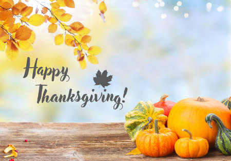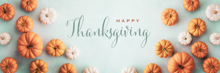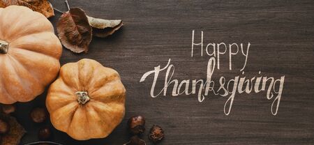 Happy Thanksgiving greeting on rustic table with pumpkins, panorama