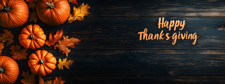 Celebrating thanksgiving day with a cheerful web banner featuring decorative pumpkins and vibrant autumn leaves artfully arranged on a rustic wooden background