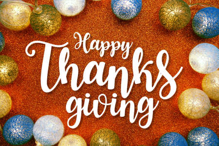 Happy Thanksgiving text and LED cotton Balls Decoration on orange Glitter background