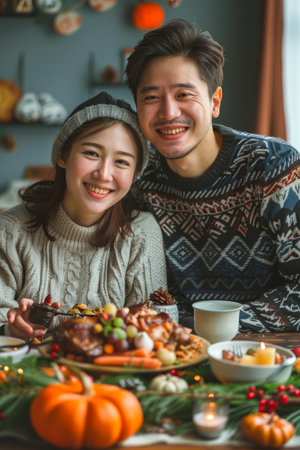Smiling Young Couple Enjoying Festive Dinner with Thanksgiving Decor, Cozy Autumn Atmosphere AI Generative