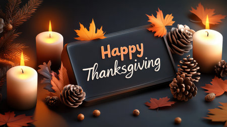 A Thanksgiving background with a chalkboard-style Happy Thanksgiving message surrounded by fall leaves, pinecones, and warm glowing candles.