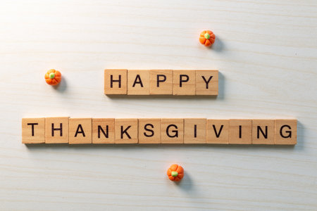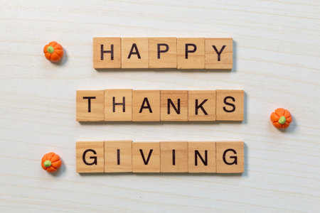Top view of wooden letter Happy Thanksgiving with mini pumpkins on light wood background, festive minimal holiday concept.