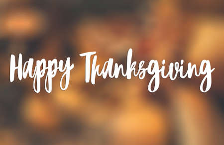 Happy Thanksgiving greeting card. Happy Thanksgiving text handwritten on blurred orange and yellow background of pumpkins, autumn leaves, cozy sweater. Seasons greetings