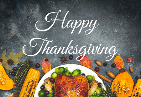 Happy Thanksgiving lettering on a festive dinner background. Food table background with autumn seasonal specialties for Thanksgiving Day. Fried chicken with pumpkin, vegetables and autumn decor