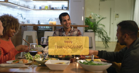 Image of happy thanksgiving day text over happy diverse friends eating. Thanksgiving day, celebration and digital interface concept digitally generated image.