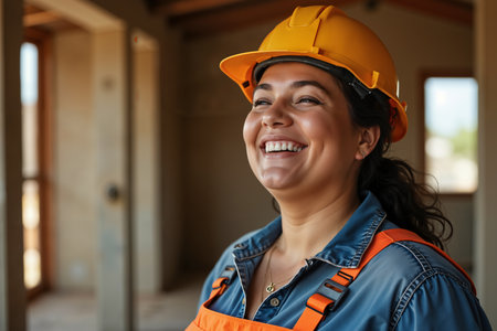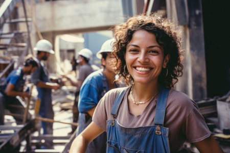 A cheerful Brazilian engineer in a blue hat embraces her job at a lively construction site.