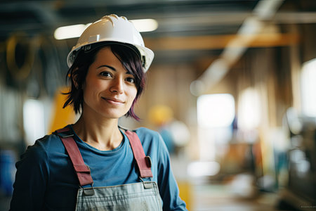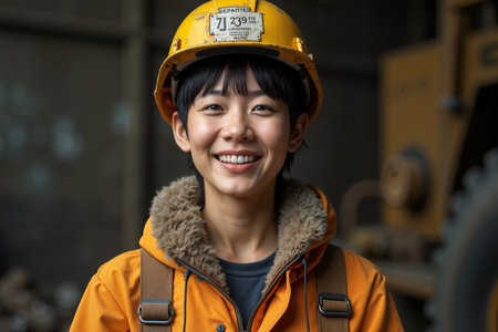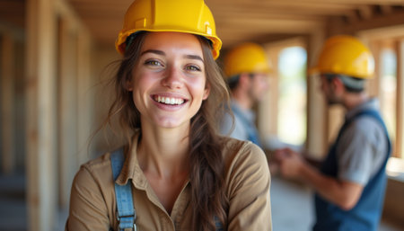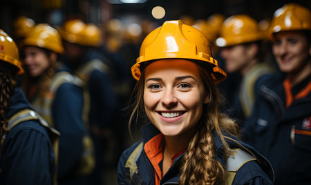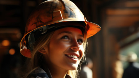 A woman wearing a hard hat smiling, AI