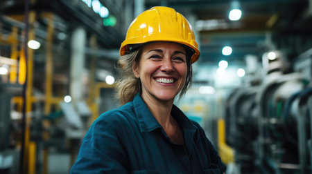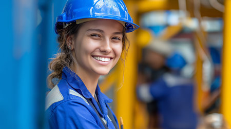 A smiling confident female engineer at an oil refinery, Overseeing operations and ensuring the efficient production of petroleum products.
