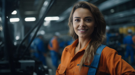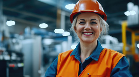 Portrait of female chief engineer in modern industrial factory looking at camera.
