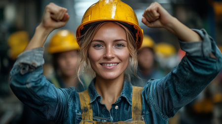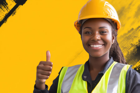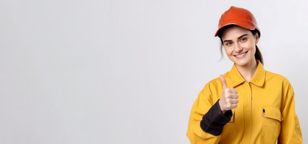 Excited female construction worker giving a thumbs up on her first day on the job. Concept Women in construction, first day on the job, thumbs up gesture, excited expressions, professional photoshoot
