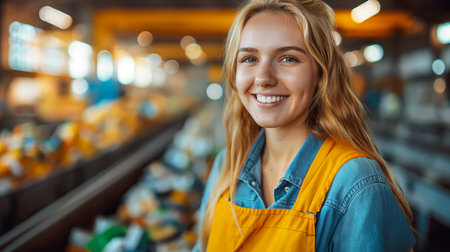 Female worker works near conveyor belt in recycling plant