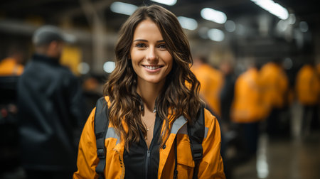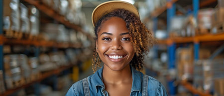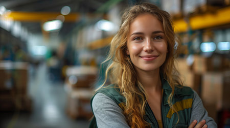 Woman Working in Modern Warehouse Smiling, Showcasing a Positive Work Environment and Commitment to Logistics Generative AI