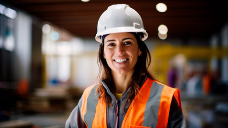 AI Generated. A woman wearing a bright orange safety vest and a hard hat is smiling