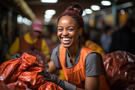 Portrait of Smiling young female and diversity volunteer worker group enjoy charitable social work outdoor in cleaning up garbage. Volunteer concept. Generative Ai