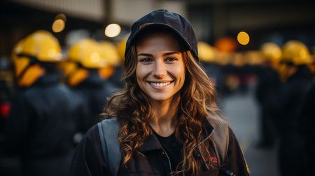 Young woman firefighter banner. Fashion safety serious model urgency. Generate Ai