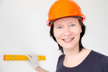 smiling woman builder in orange helmet holds engineer level on white background. copy space
