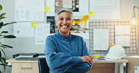 Portrait, happy woman or confident in agency for architecture, career pride or opportunity for housing development. Mature engineer, smile or arms crossed in firm with creative for project management
