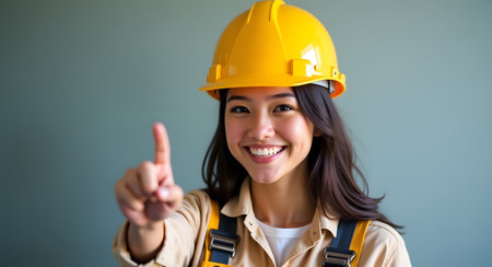 Portrait of smiling female construction worker pointing finger up on gray background