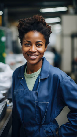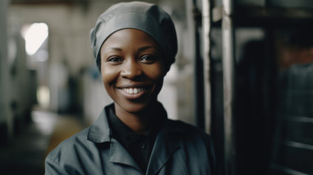 African woman in her 30s, smiling, happy, working in a factory
