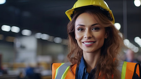 A Beautiful Smiling on Camera Female Engineer in Safety Vest and Hardhat. Professional Woman Working in the Modern Manufacturing Factory.Generative Ai