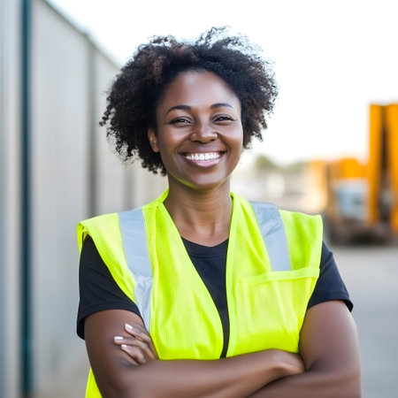 Portrait of happy african american female worker at construction site with a safety vest
