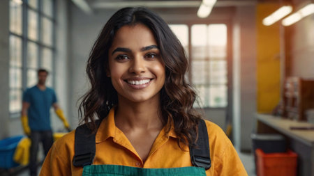 A smiling Indian female construction worker standing in construction site. Generative AI AIG19.