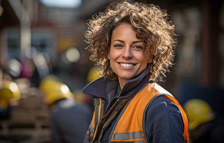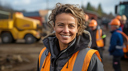Featuring a proud middle-aged woman wearing a work vest and construction hard hat, she is seen working on a construction site.