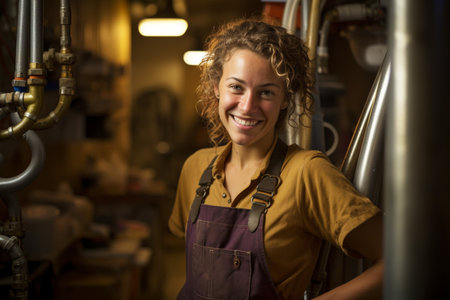 handywoman repairing pipe in the mechanical room bokeh style background