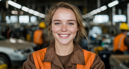 Young woman wearing a hard hat and safety vest, likely a construction worker or mechanic, is smiling at the camera with a background of industrial machinery.