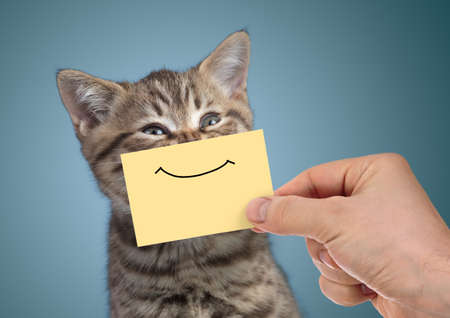 A cute striped kitten smiles contently while posing against a simple white background exuding pure happiness and playfulness.