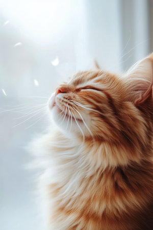 A fluffy orange cat basks in warm sunlight streaming through a window, eyes closed and face relaxed. The tranquil atmosphere highlights the contentment of the feline.