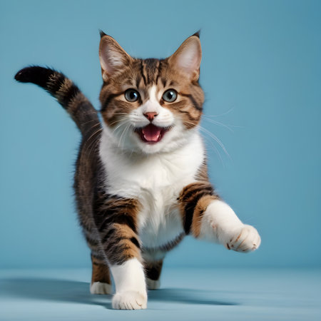 Tabby cat is suspended in the air with its paws outstretched, appearing to fly or jump against a blue background