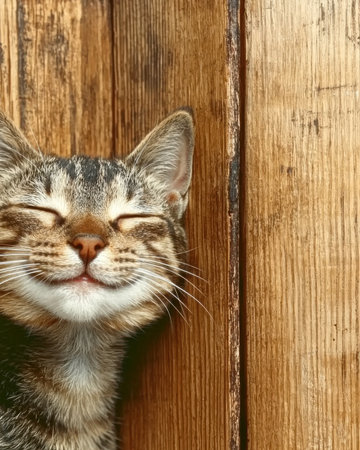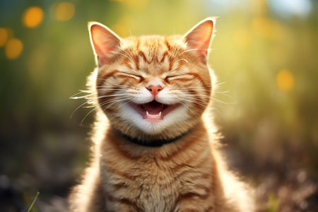 A cat with a big smile on its face is looking at the camera. The cat's eyes are closed, and it is enjoying the moment. Concept of happiness and contentment