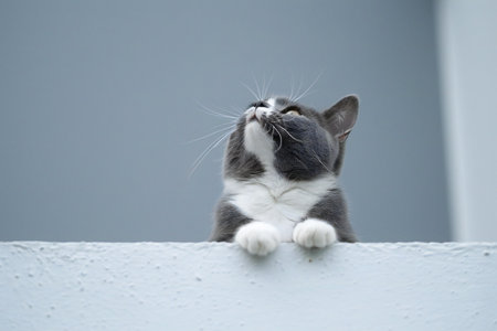 Gray cute cat against a blue sky looks in the left side. Kitten seeking new adventures, opportunities. Find a new host. Go on the specified path. Freedom concept. Predator. copy space
