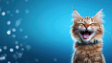 Happy orange cat with closed eyes and open mouth on vibrant blue background.