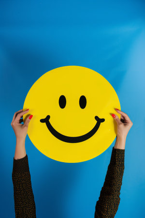 A close-up view of a hand holding a yellow smiley face sticker, symbolizing happiness and positivity. Ideal for themes related to joy and well-being.
