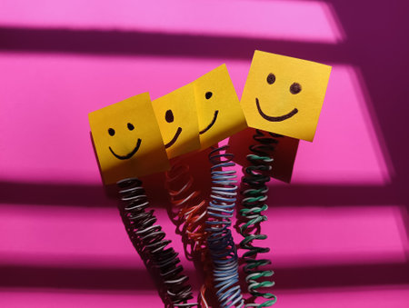 Funny smiley faces on sticky notes with spring on pink background