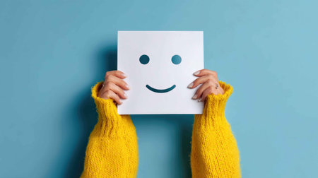 A hand holding a smiling face symbolizes a positive mindset, constructive feedback, a joyful approach to life, and a commitment to a healthy lifestyle.