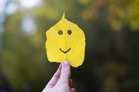 Autumn leaf emoji, smiley in a hand