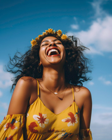 A joyful woman radiates happiness as she stands outdoors under the sunlight. Her flowing hair dances in the breeze, capturing a moment of pure delight.